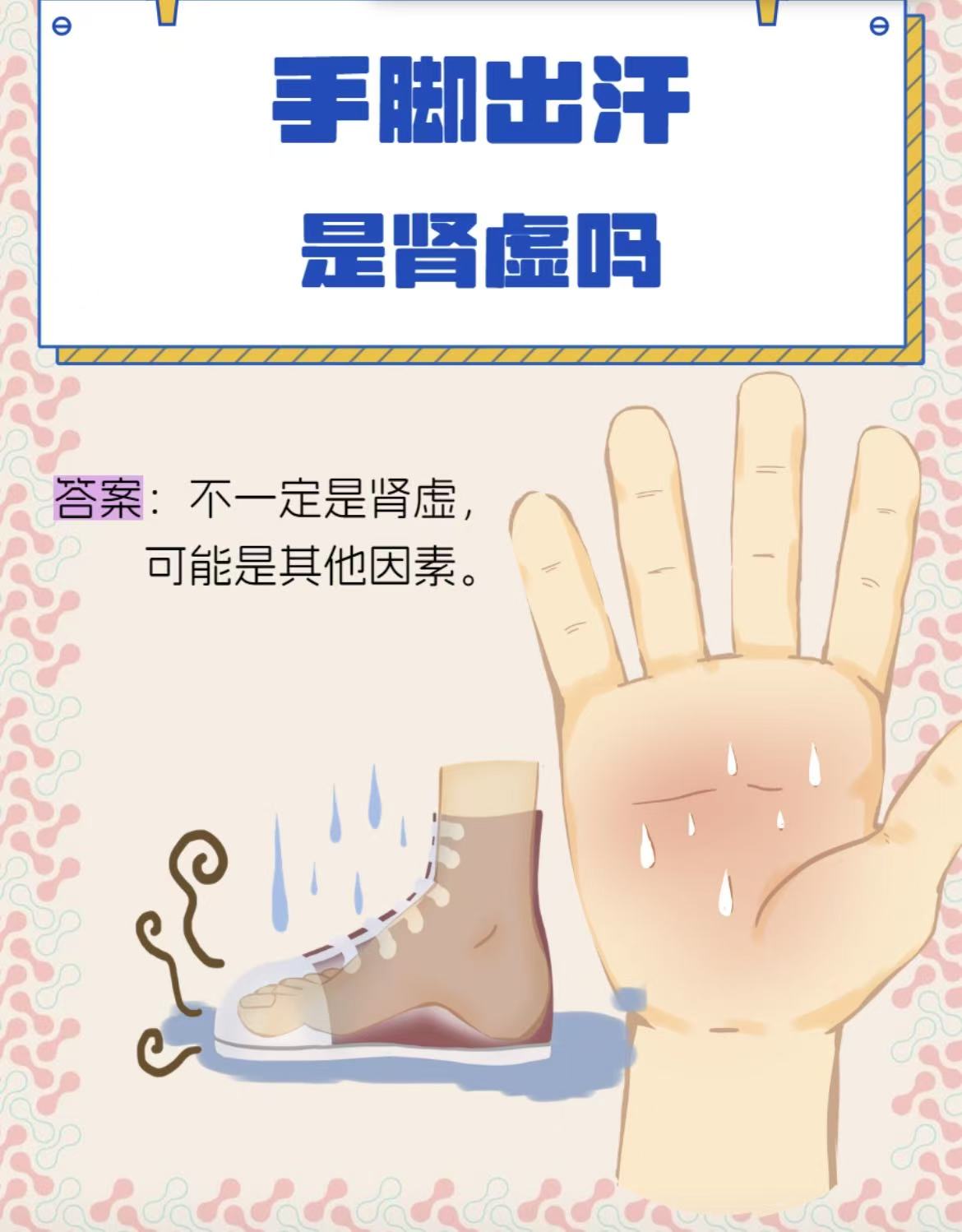 核心问题 交感神经过度兴奋,导致手部汗腺分泌异常旺盛。 肾的功能(藏精、主水、纳气、主骨生髓等)衰退或失衡。